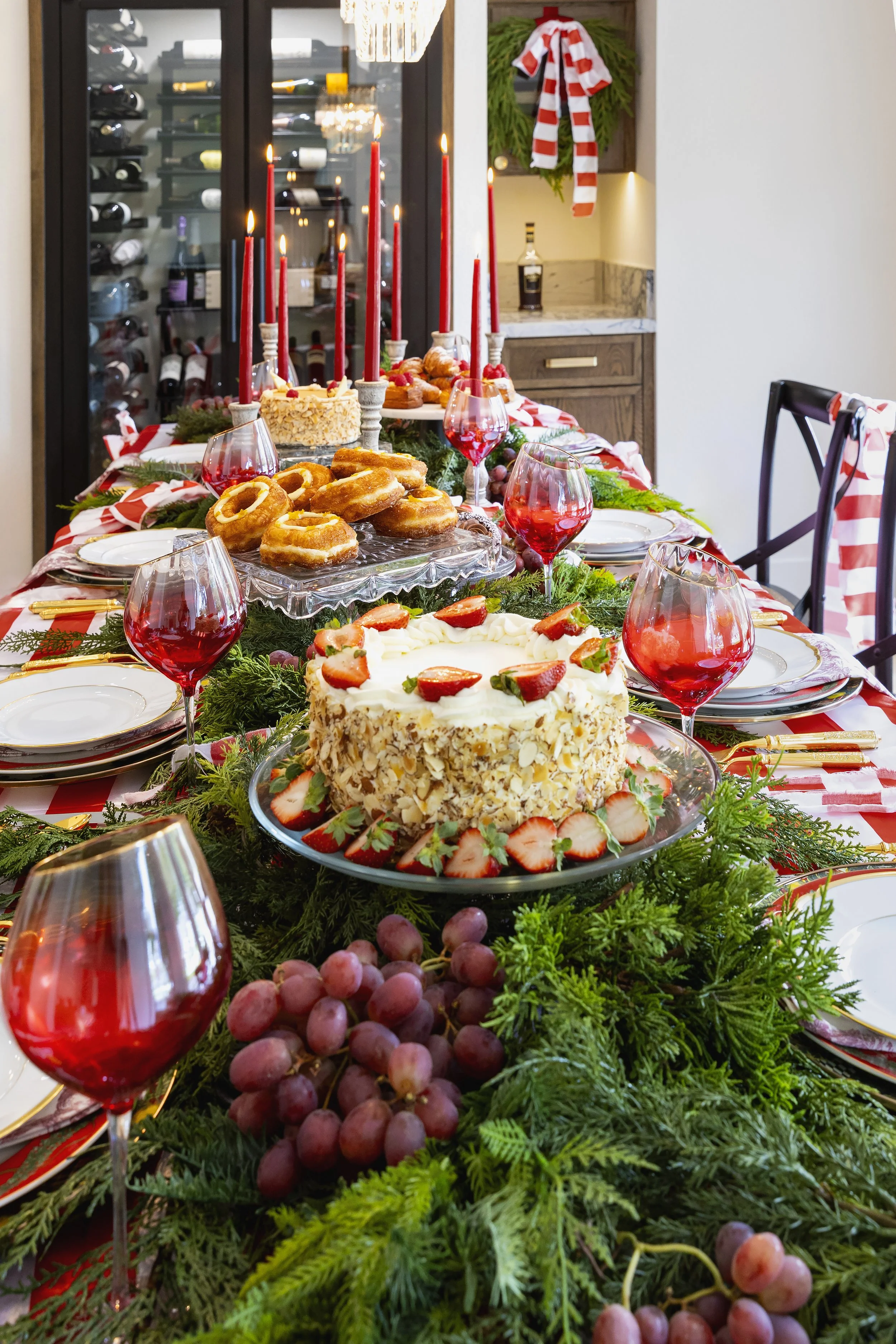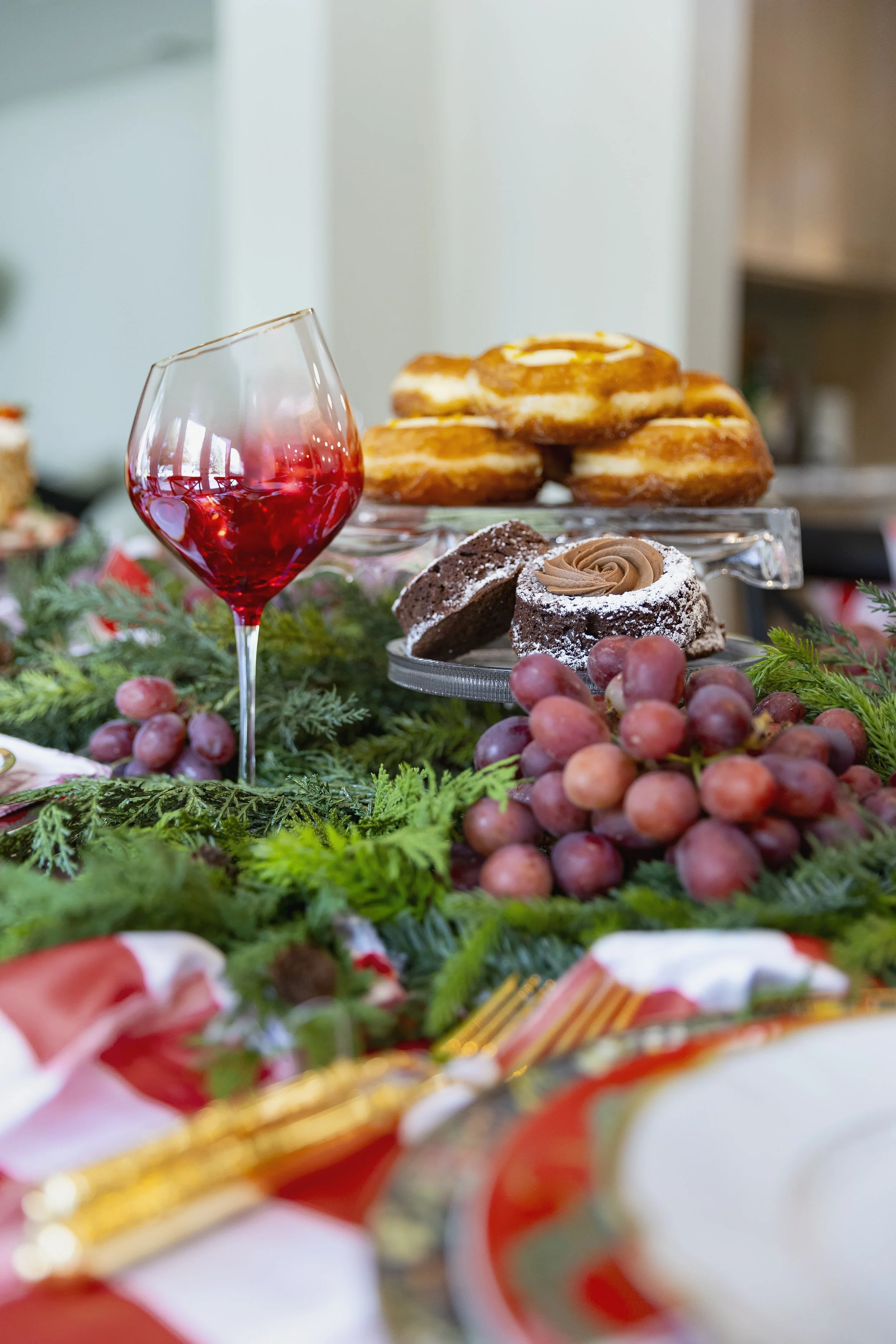 A holiday table should invite participation. Weave edible elements into your greenery—think figs, pomegranates, grapes, or citrus fruits guests can snack on. Elevate desserts on cake stands and scatter them throughout the tablescape to build anticipation for what’s to come. The result? A table that’s as engaging as it is beautiful, encouraging guests to linger long after the last bite.