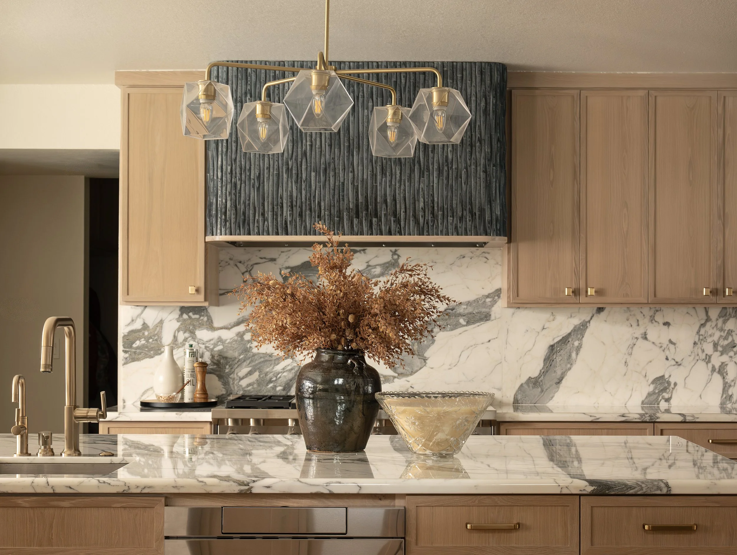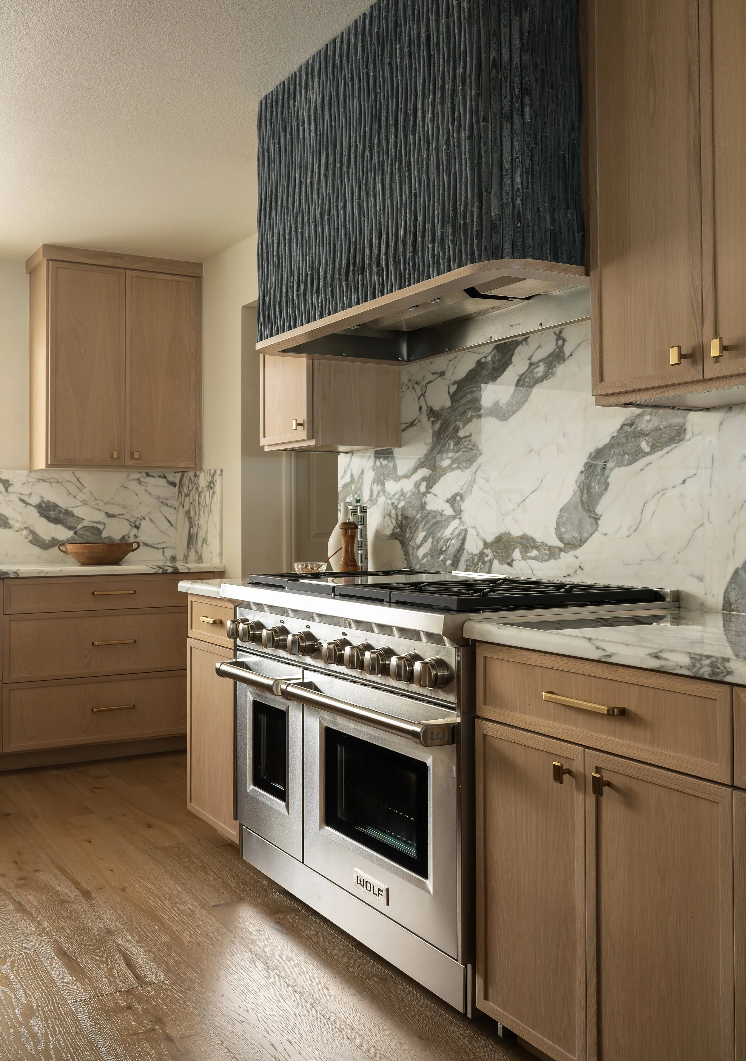 To truly elevate the space, we clad the hood in a beautiful reeded slate tile with a subtle wave pattern. This was a last-minute decision, but it pulls the room together and creates a unique focal point. The color contrasts nicely with the cabinetry and countertops, and the natural stone introduces another layer of richness and depth.