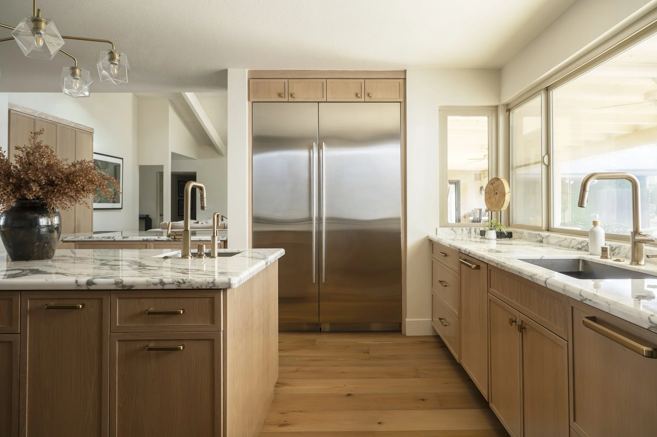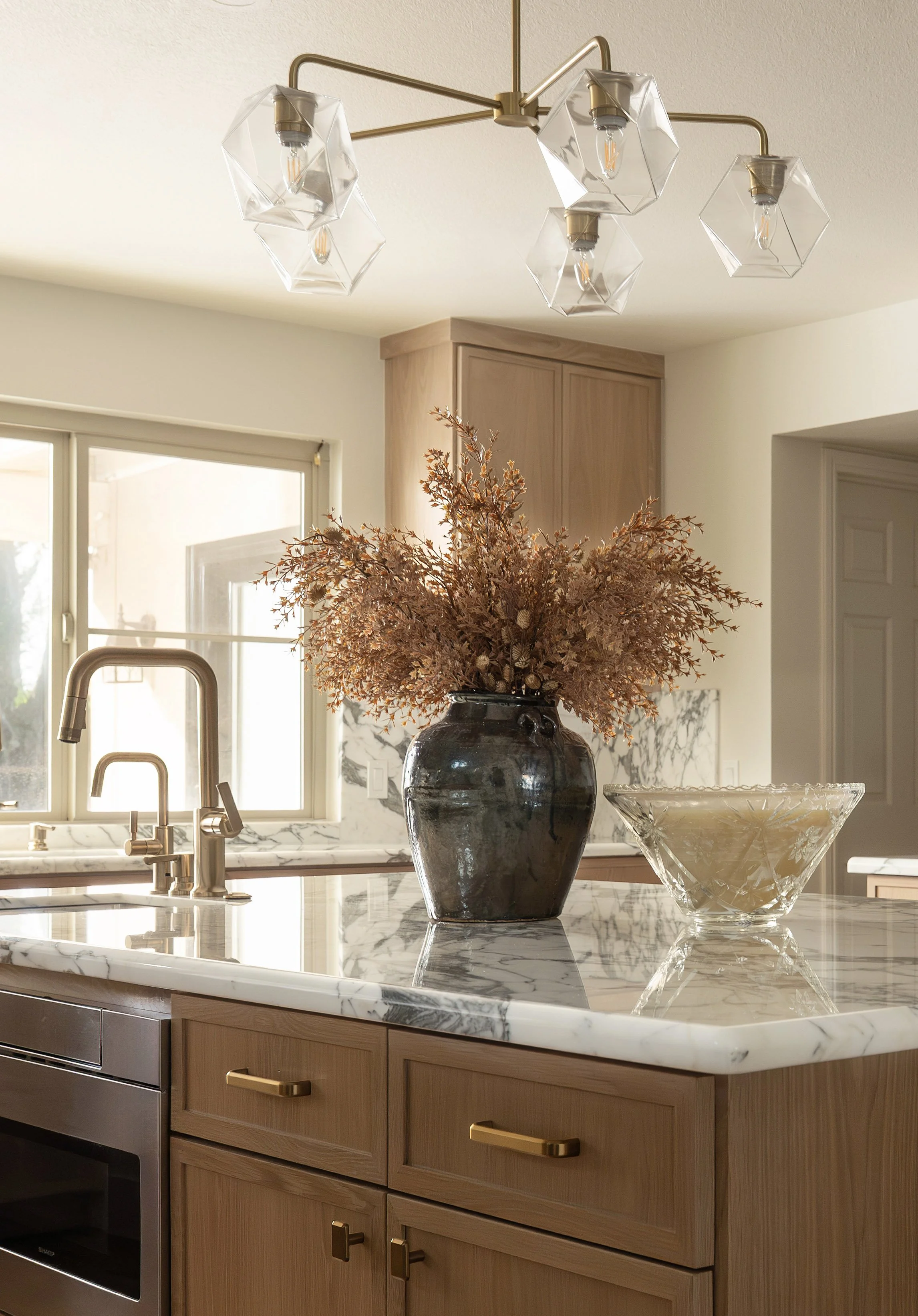 Once the floor plan was finalized, we collaborated with the clients to create the kitchen of their dreams. In the previous design, we used a lot of white—white cabinets, white countertops, and white walls. It was a definite upgrade from the original kitchen, but after several years, it was time for a refresh. For this redesign, we focused on introducing warmth, luxurious finishes, and unexpected earthy accents.