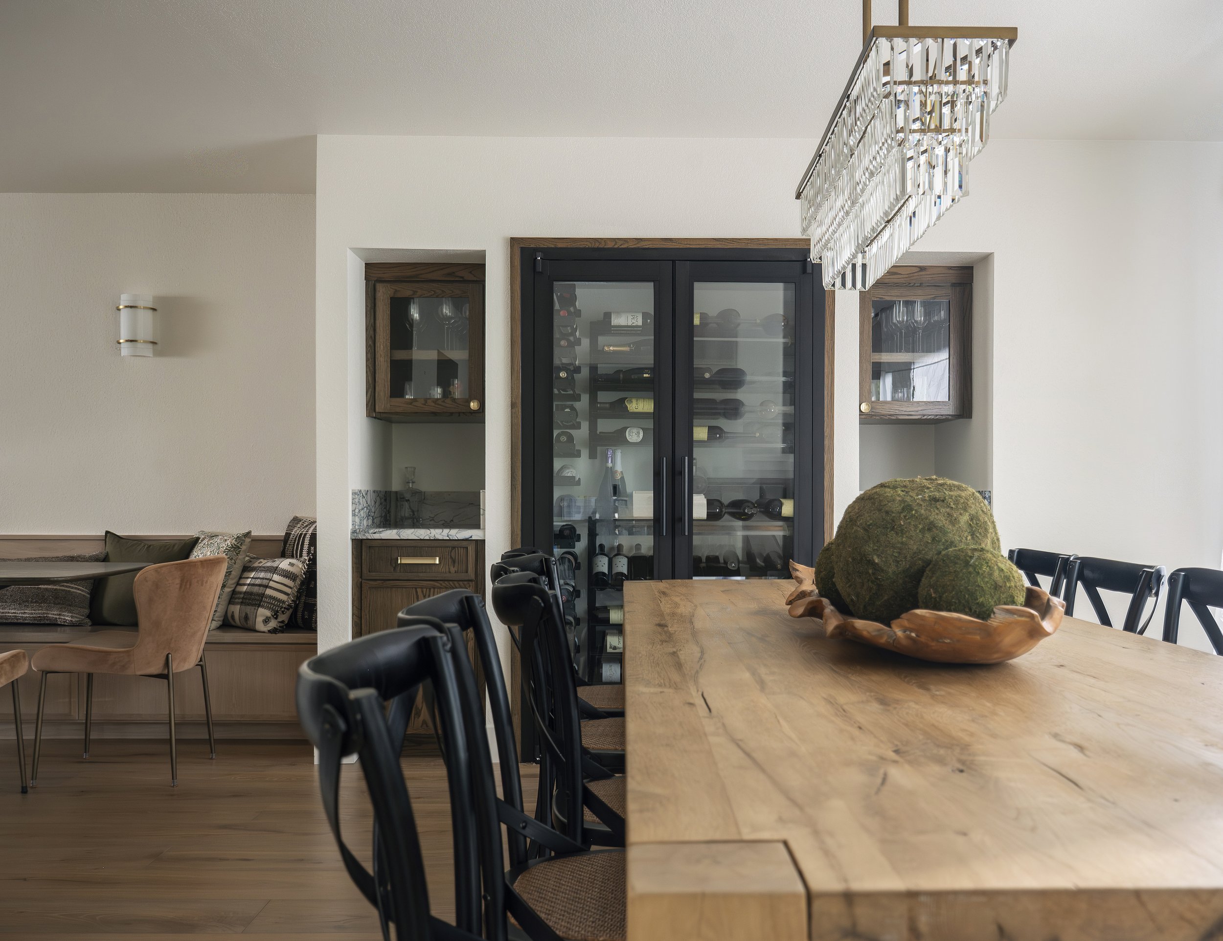 The dining room was expanded, and a beautiful chilled wine cellar was added. It is flanked by two built-in walnut cabinets, perfect for serving cocktails and displaying special bottles.