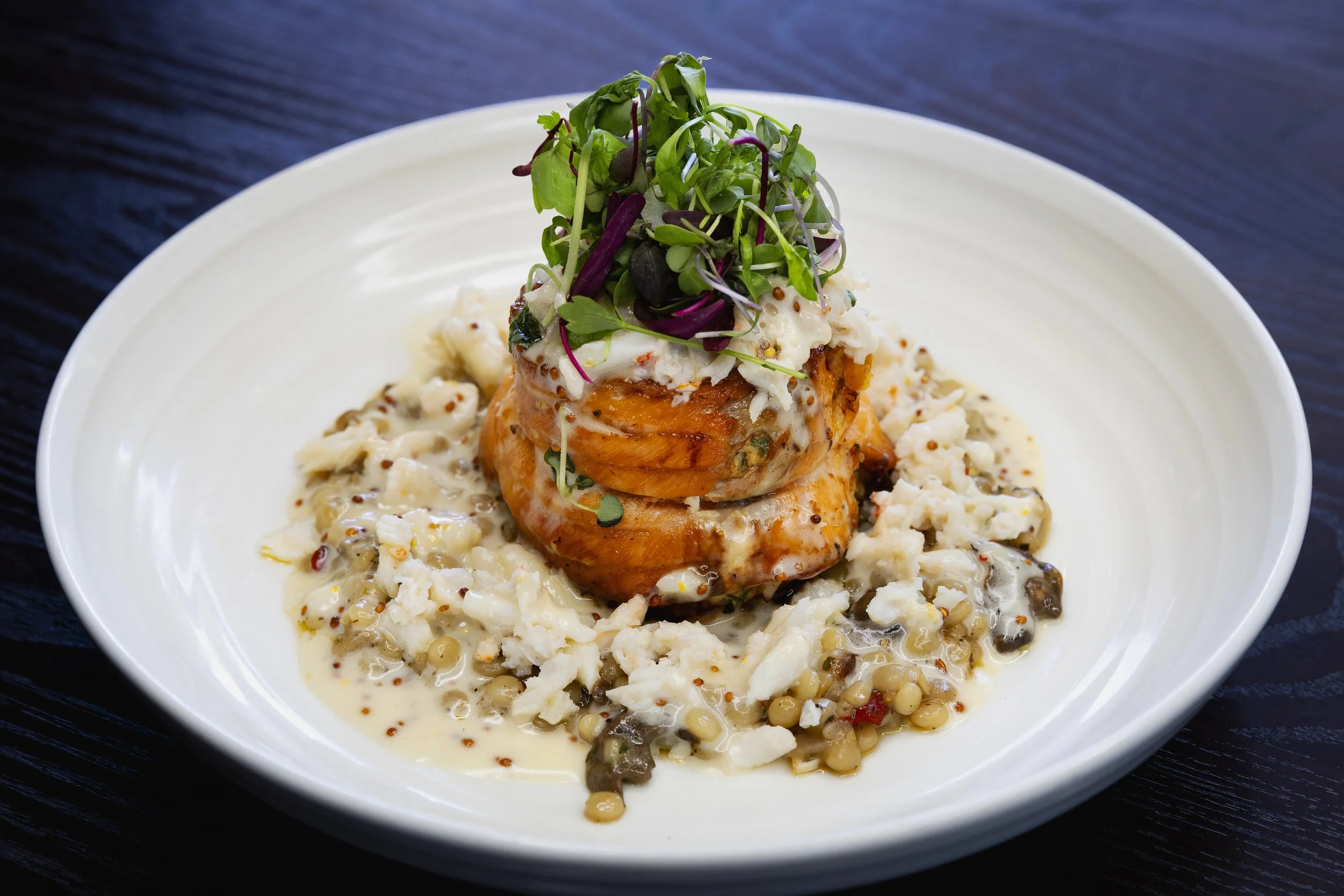 The Crab Stuffed Salmon makes for a stunning presentation. The fish is filled with whipped brie and served on a bed of couscous with arugula and lemon zest. A lovely, light Dijon beurre blanc finished the dish. The creaminess of the cheese inside the filet creates an interactive experience, and the resulting melt doubles as a secondary sauce.