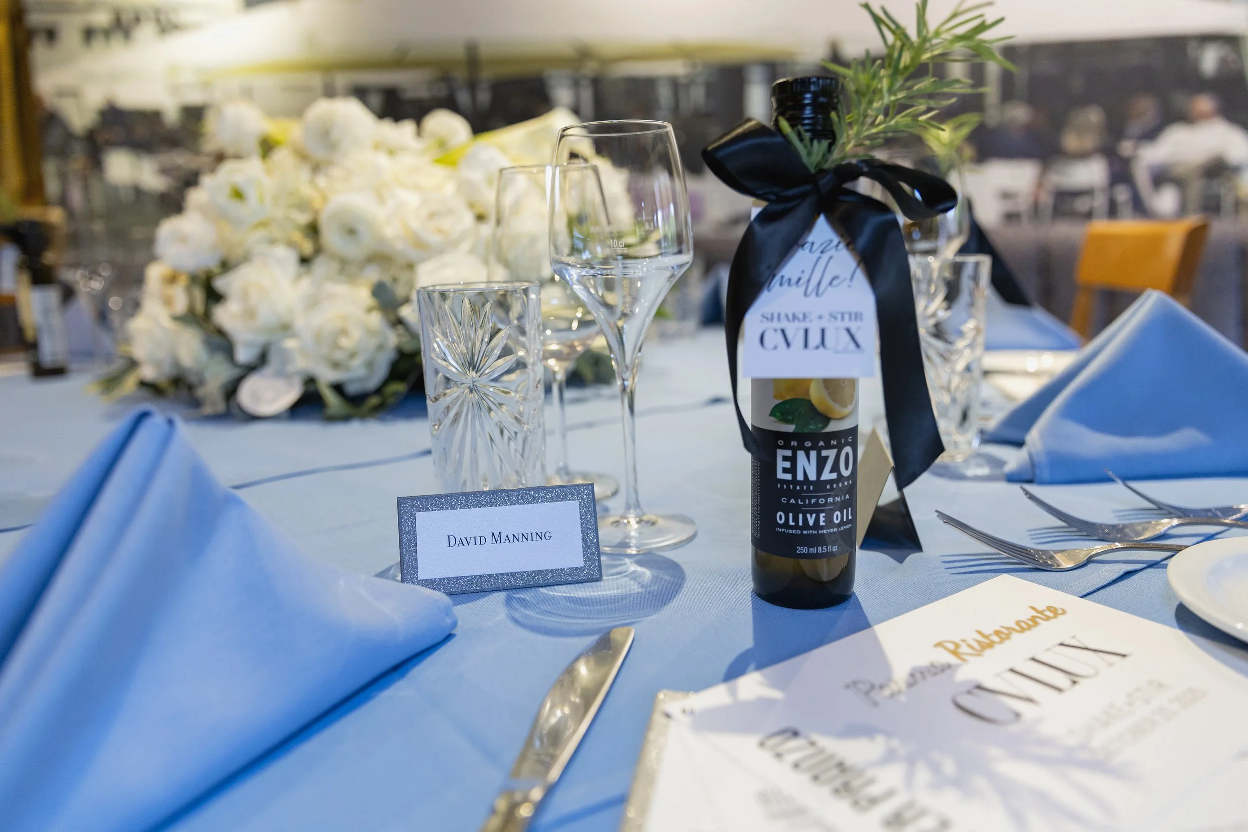 Parma’s signature powder blue and pale yellow napkins served as the tablescape baseline. Florals featuring white and green with olive branches came from Blooming Beauty Floral & Events. Curated Giftables was responsible for guest favors: a bottle of Enzo Lemon Olive Oil. Modern Press Paper Studio crafted custom menu books and place cards for each guest. Everyone gathered around the bar upon arrival before being seated in the main dining room at Parma, where a wallpapered picture of the Piazza Garibaldi set the backdrop for the afternoon featuring five courses that then unfolded.