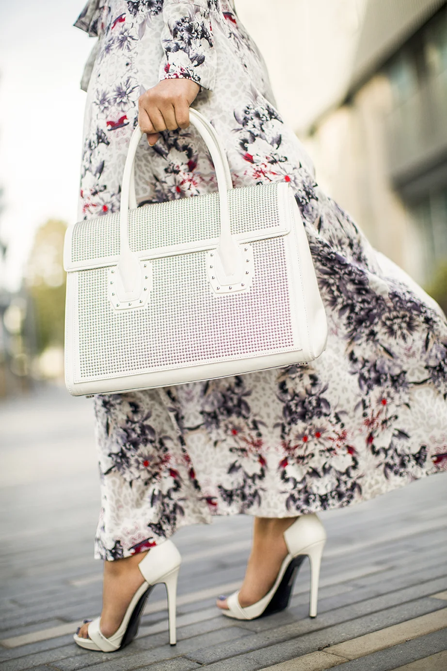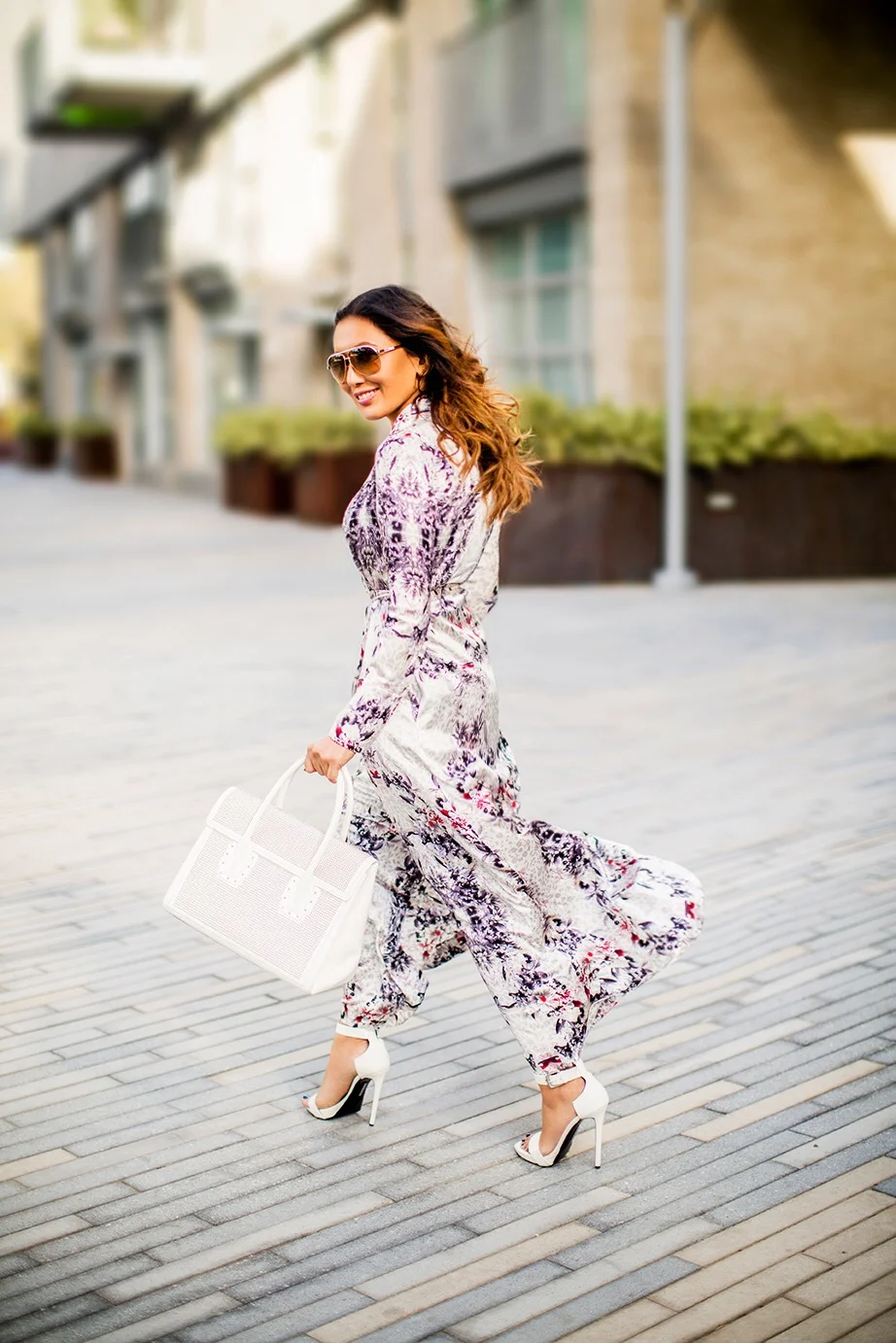White accessories, in my opinion, are the ultimate in luxury. Maybe I'm bias as it is my favorite color but when added to any outfit it is surely to make a statement. The bold floral graphic design in this Thomas Wylde wrap dress is impeccably executed and one of my favorite pieces for the modernity and unique take on the classic.