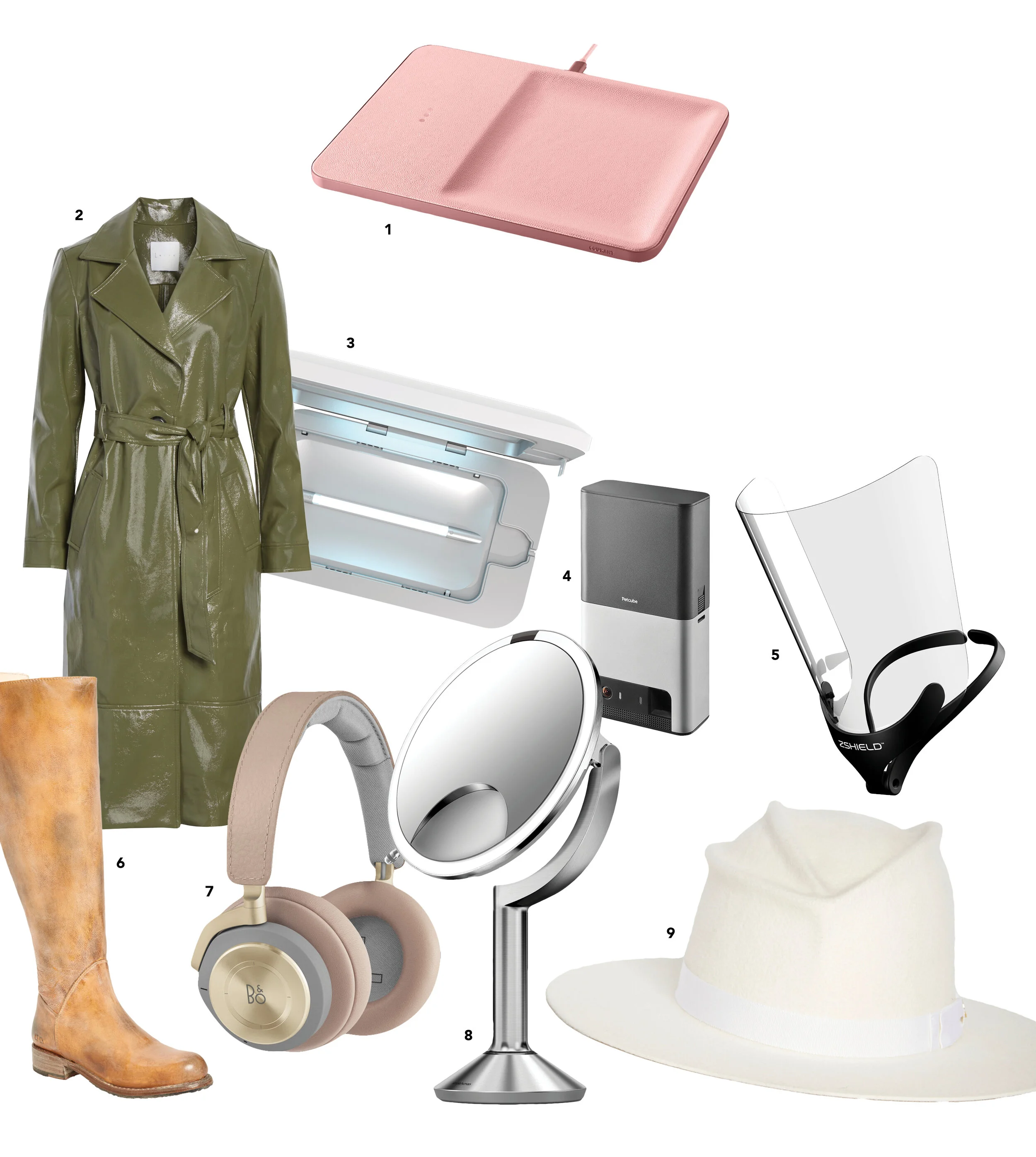 1. Courant CATCH:3 Single Device Wireless Charging Station w/Accessory Organizer in Pink $175.00 from www.neimanmarcus.com 2. Leith Faux Patent Leather Trench Coat in Olive Night $149.00 from www.nordstrom.com 3. PhoneSoap 3 Smartphone UV Sanitizer in White $79.95 from www.phonesoap.com 4. Petcube Bites 2 Wi-Fi Pet Camera w/Treat Dispenser and Alexa Built-in, for Dogs and Cats $199.37 from www.amazon.com 5. ZShield Wrap $22.99 from www.zshield.com 6. Bed Stu ‘Manchester II’ Boot in Tan Rustic Leather $295.00 from www.nordstrom.com 7. Bang & Olufsen Beoplay H9 3rd Generation in Argilla Bright $500.00 from www.neimanmarcus.com 8. simplehuman Sensor Mirror Trio in Rose Gold $300.00 from www.simplehuman.com 9. Gladys Tamez Millinery Hunter Hat $550.00 from www.gladystamez.com