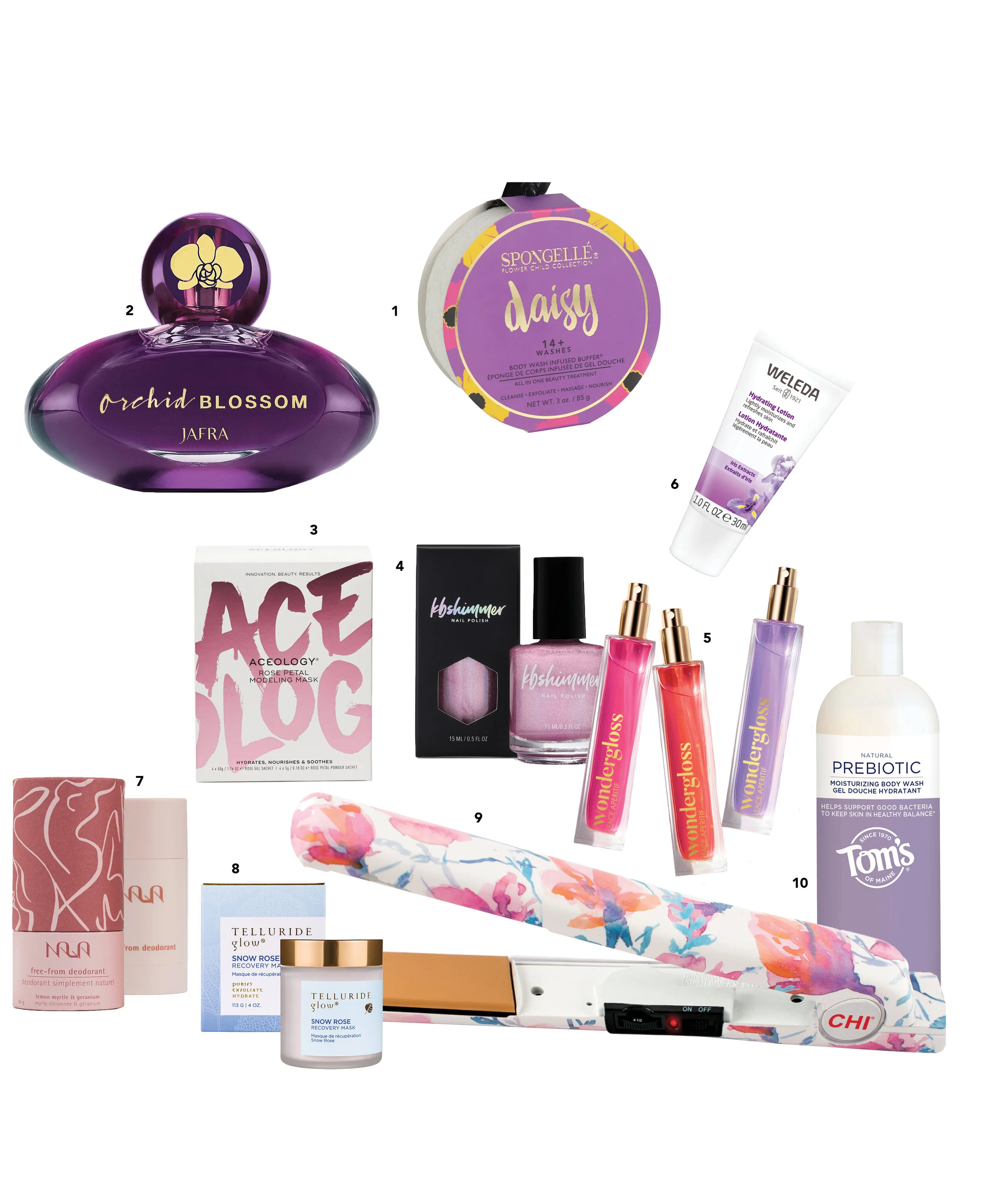 1. Spongellé Daisy | Flower Child Body Wash Infused Buffer $12.00 from www.spongelle.com 2. JAFRA Orchid Blossom Eau de Perfume $34.00 from www.jafra.com 3. Aceology Rose Petal Modeling Mask (X4) $79.00 from www.aceology.com 4. KBShimmer Peony Pincher Nail Polish $10.00 from www.kbshimmer.com 5. wondergloss Face Aperitif: Hydrating Facial Mist in Orange Blossom, Rose, and Jasmine $40.00 each from www.wondergloss.com 6. WELEDA Hydrating Lotion - Iris $23.99 from www.weleda.com 7. Nala Lemon Myrtle & Geranium Deodorant $26.00 from www.nalacare.com 8. Telluride Glow Snow Rose Recovery Mask $75.00 from www.tellurideglow.com 9. CHI Classic Tourmaline Ceramic 1” Hairstyling Iron - Petal Party $99.99 from www.amazon.com 10. Tom’s of Maine Prebiotic Body Wash in Gentle Lavender $7.99 from www.walmart.com